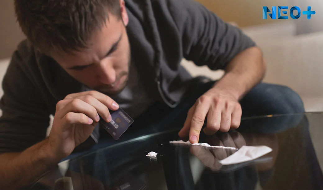Мужчина наклонился перед столом с белым порошком